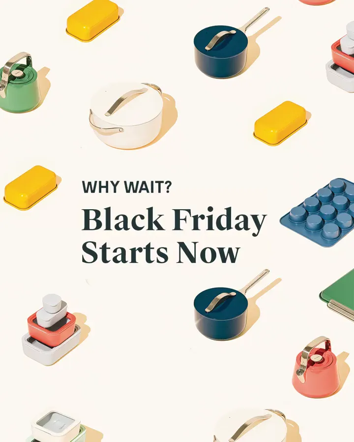This ad uses a silent, product-only showcase to make the cookware's colorful design the hero. It hooks viewers instantly by opening with a bold 'Black Friday Starts Now' headline, creating immediate urgency. This simple visual-plus-offer approach is built for sound-off social feeds.