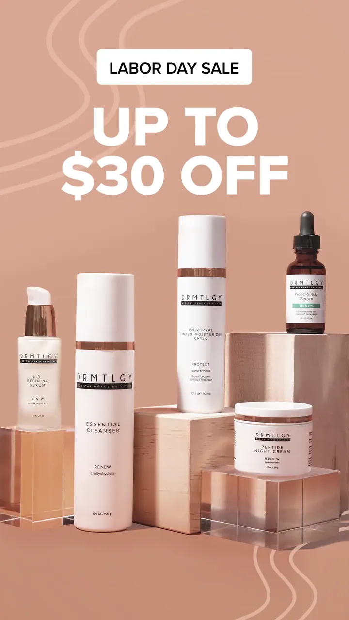 The ad hooks viewers instantly with a prominent 'Labor Day Sale' headline, making the offer unmissable. Its minimalist, static shot focuses all attention on the product lineup, creating a sophisticated brand aesthetic. This approach works well for communicating a clear discount on hero products.