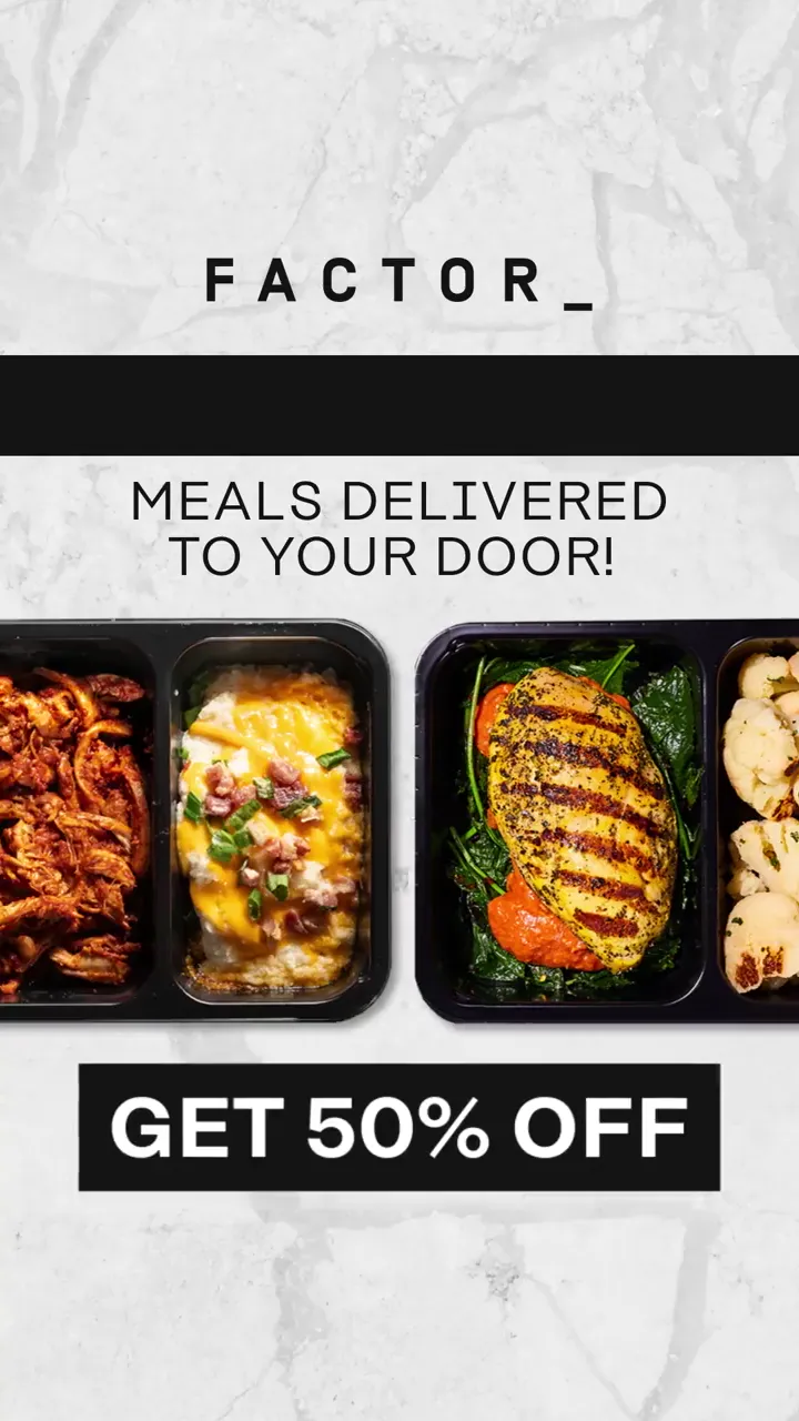 This ad rapidly showcases different meal plans in the opening seconds, quickly segmenting viewers by dietary preference. By keeping the '50% Off' offer constantly on-screen, it creates strong, persistent urgency. The video relies solely on high-quality product shots, a direct creative choice.