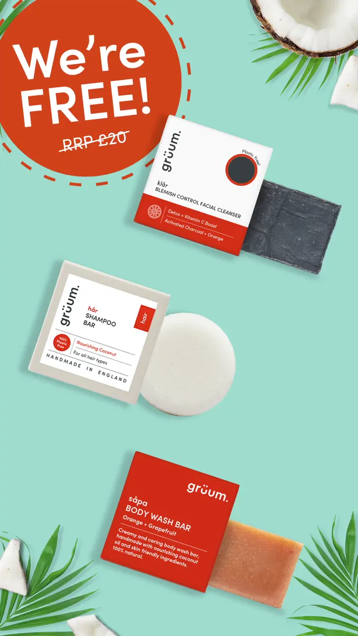 The ad opens by placing the 'FREE' offer and its £20 RRP front-and-center, creating an immediate value proposition. It uses a single, well-composed static image with props like coconuts to quickly communicate the 'natural' ingredients theme without costly video production.