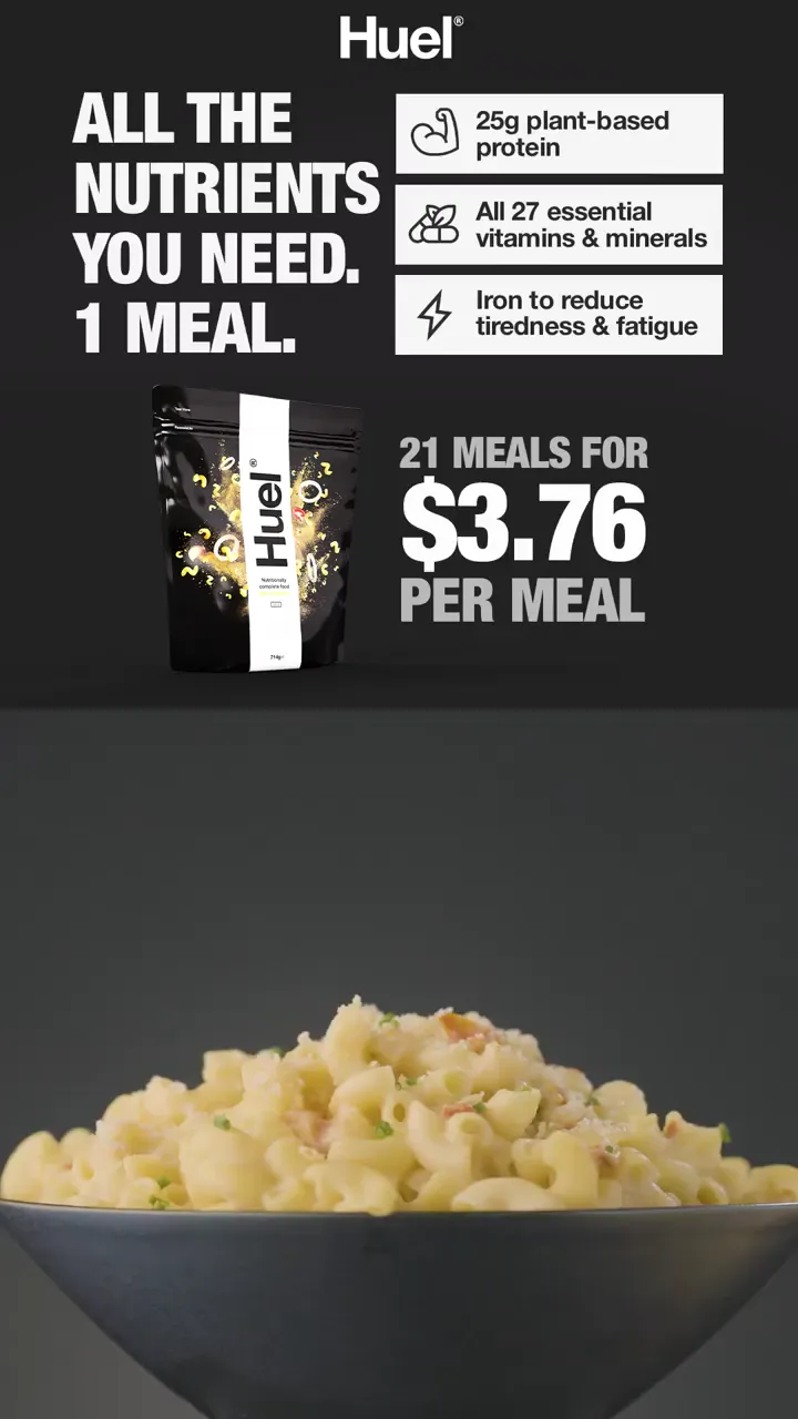 The ad leads with its strongest claims—nutritional stats and the per-meal price—right in the first 2 seconds for an effective hook. Dynamic visuals of the meal deconstructing and reassembling keep the product-only shot from feeling static. It's a great example of a silent-first ad for social feeds.
