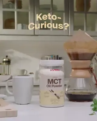The ad opens with a 'Keto-Curious?' text hook to immediately qualify its target audience. It then uses quick, clean demos showing the powder in both hot and iced coffee, making the product's value instantly clear. Relying solely on visuals makes it effective for sound-off viewing.