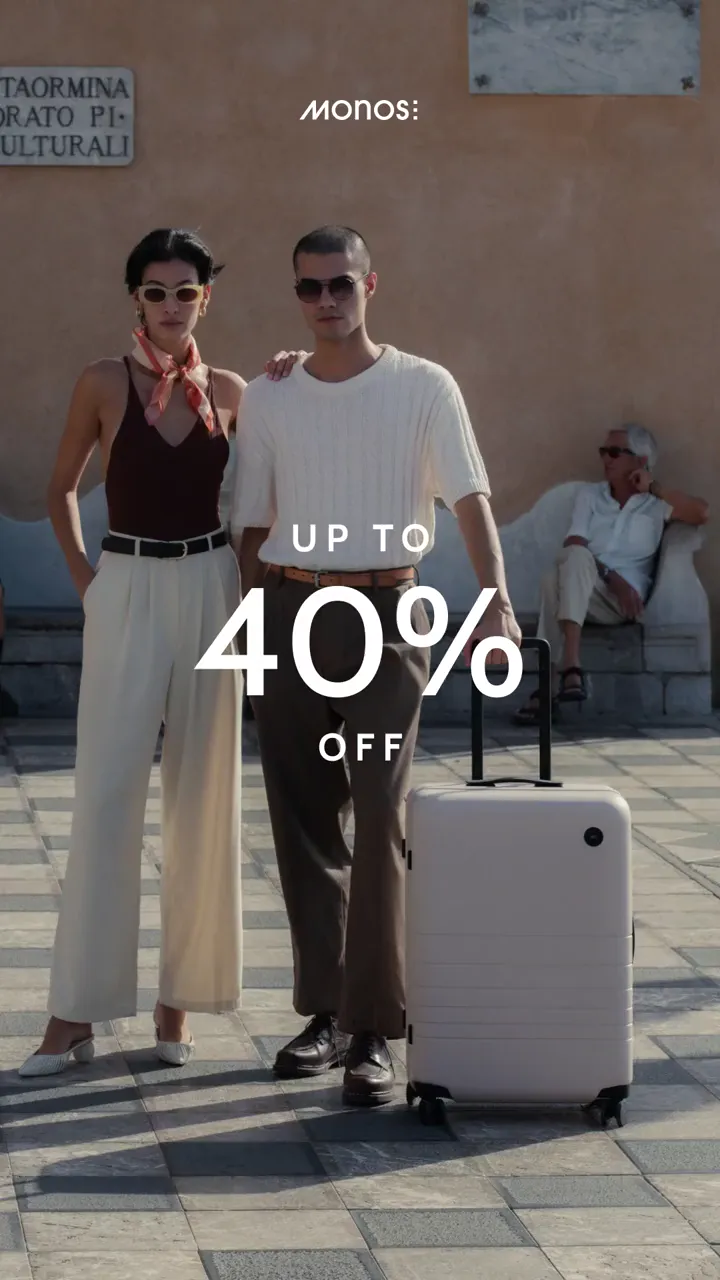 This ad uses a rapid-fire montage of lifestyle shots to quickly showcase product versatility across multiple travel contexts. The prominent 'Up to 40% Off' text overlay is the main hook, immediately framing this as a conversion-focused sale ad. Its silent design ensures the message works in sound-off feeds.