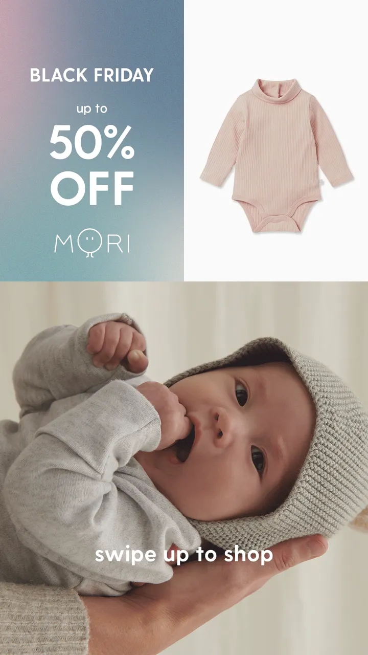 The ad hooks viewers instantly by opening with the 'Black Friday 50% Off' offer. It then uses a rapid 4-second product showcase to display the range of the sale. This silent-first visual approach with a simple CTA is built for quick, decisive action on the feed.
