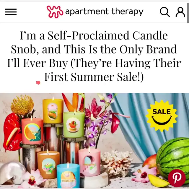 This ad uses third-party credibility from a publication like Apartment Therapy to build instant trust. The 'candle snob' headline is a clever hook that frames the product as premium, immediately followed by a clear 'Summer Sale' call to action to drive conversion.