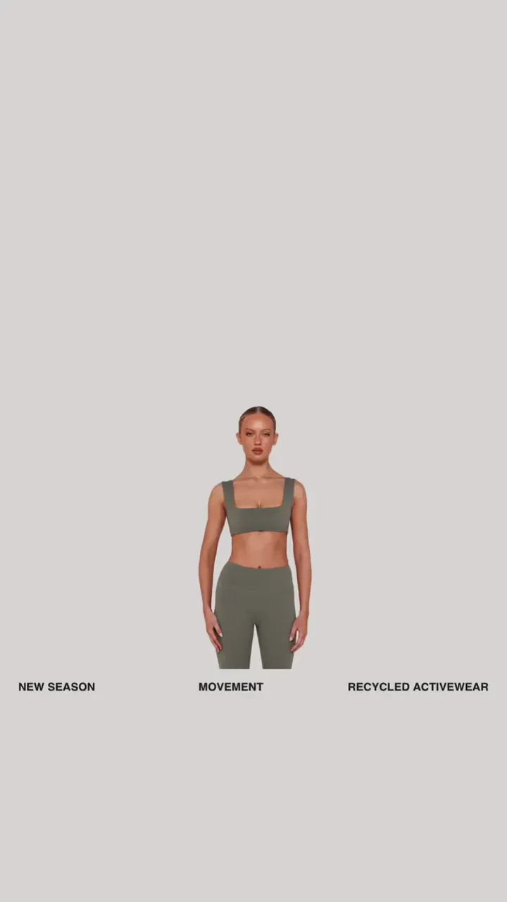 This ad uses a static, multi-model shot to display collection versatility in a single frame. Simple text overlays like "Recycled Activewear" clearly and quickly communicate the core value props. The minimalist backdrop keeps all visual focus on the product's design and color.