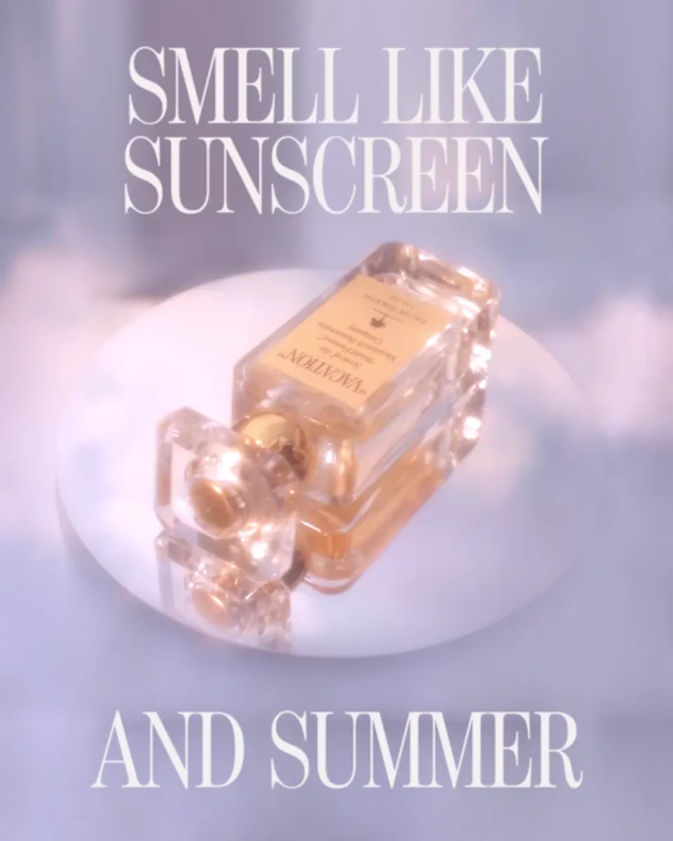 This ad's power is its simplicity: a single, rotating product shot keeps all focus on the bottle's elegant design. The bold sensory claim ('Smell like sunscreen') is the only text overlay, acting as an immediate, nostalgic hook that instantly qualifies the audience for a niche product.