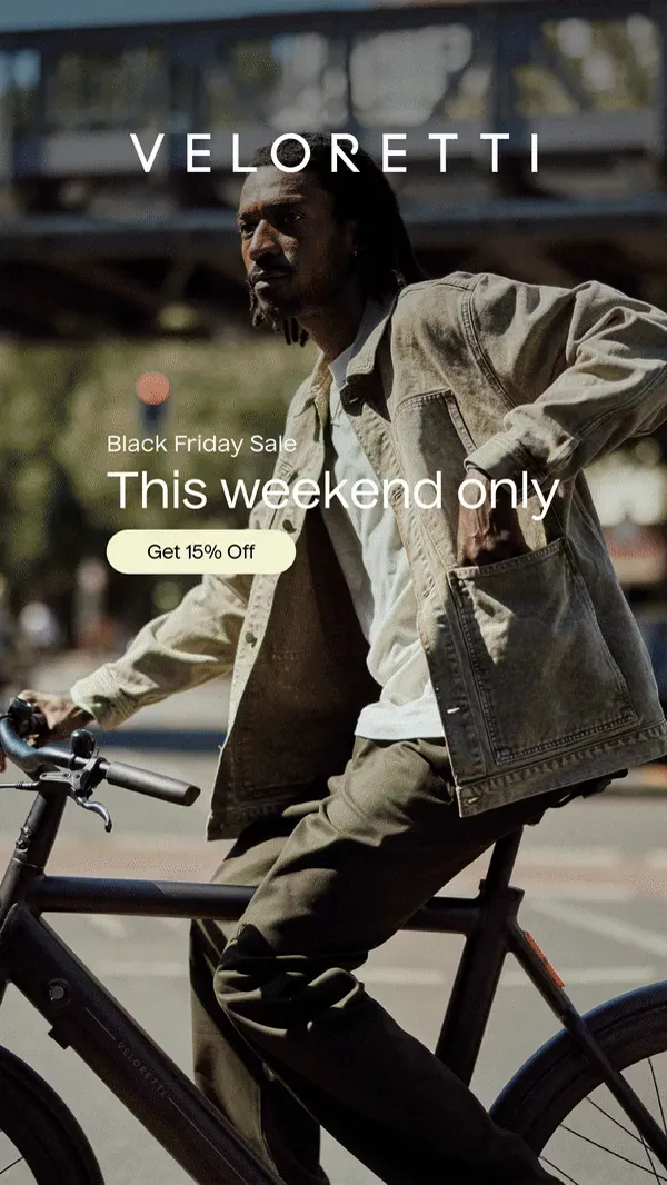 This ad rapidly showcases multiple rider personas and bike models within the first 3 seconds to broaden its appeal instantly. It immediately overlays a clear, urgent discount ("Black Friday Sale", "15% Off"), making it a pure conversion play that performs well even with the sound off.